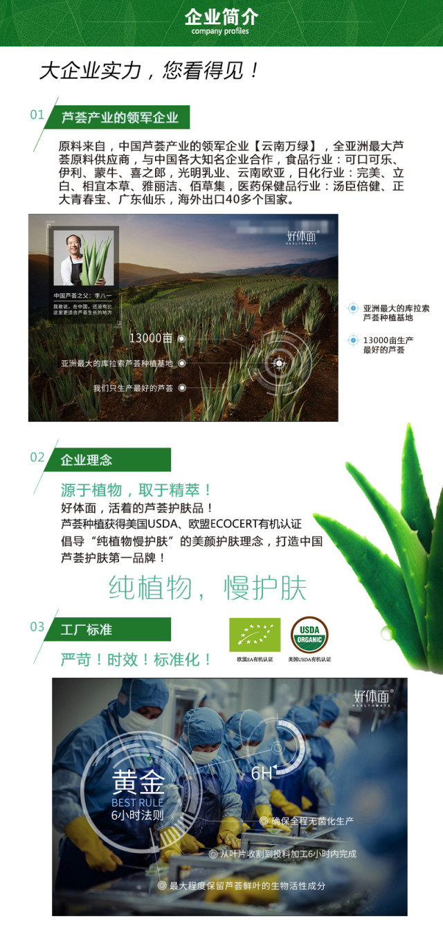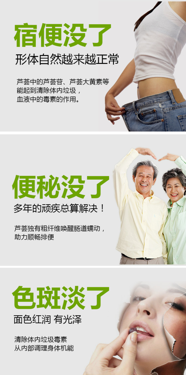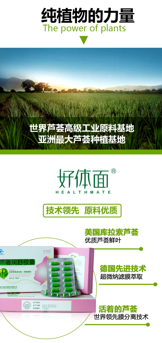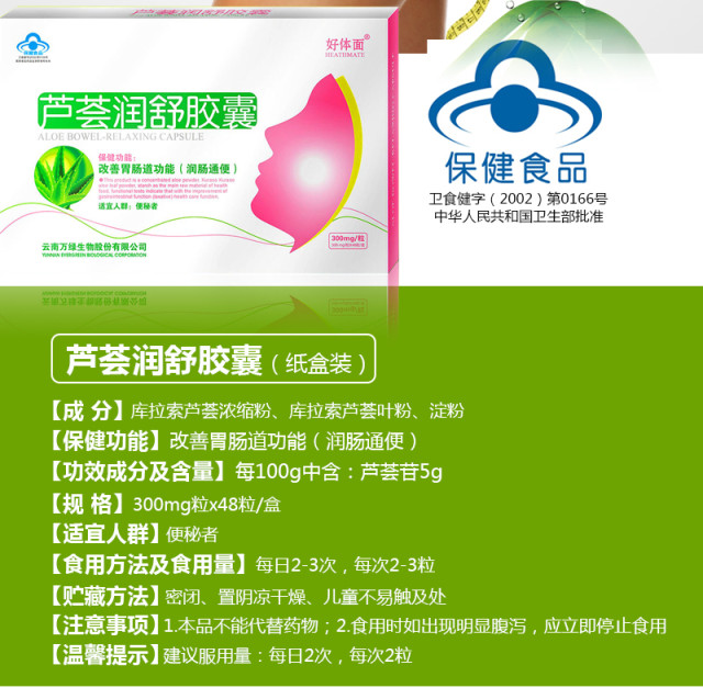 本品是采用经美国、欧盟有机认证的美国库拉索芦荟鲜叶,经烘干破碎后制成的纯植物保健食品,具有润肠通便、清热去燥的保健功能,适合便秘者及面部有痤疮者服用,本品是经国家食品药品监督管理局批准的功能性保健食品。